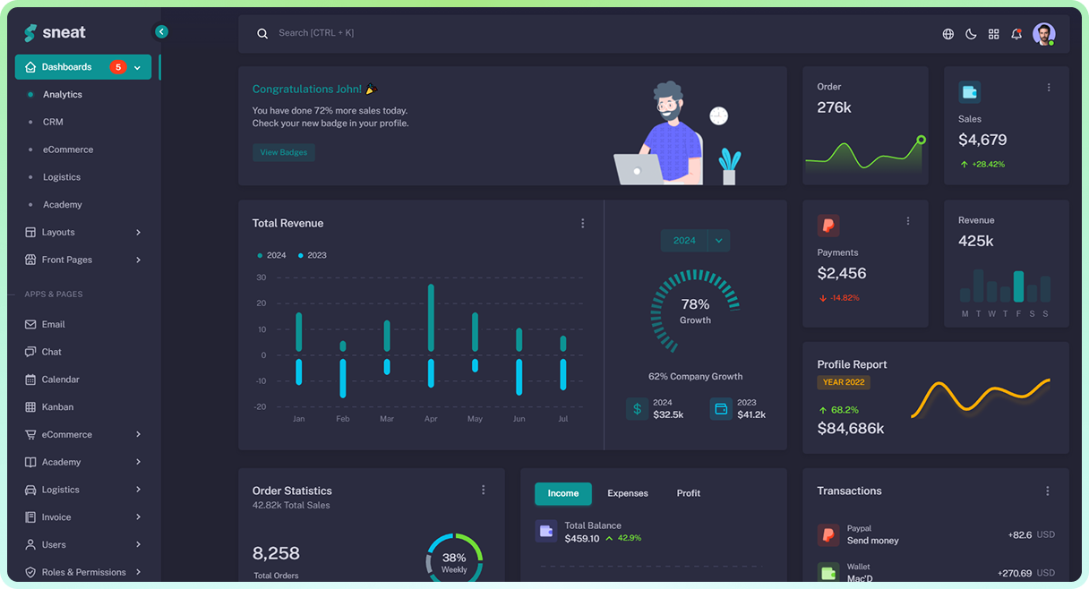 Access an organized collection of styled components alongside core boilerplate pages, including tables, charts, form inputs, and Bootstrap elements — ready to use out of the box.